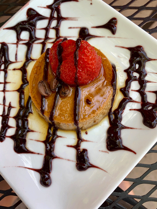 24 August 2019: Ajiaco doesn’t have a large postres (dessert) menu, offering only three items: platano con queso (plantain with cheese and guava), arepa de chocolo (sweet corn cake with cheese and cream) and flan de cafe (coffee flan). It goes without saying that the flan de cafe is made with Colombian coffee (no Juan Valdez jokes, please). What does need to be said, nay shouted from rooftops, is how tasty this terrific timbale of addictive deliciousness is. Unlike some traditional flan, this version isn’t cloying, and is balanced by the punchy, bitter coffee flavor permeating the dessert. A sauce made from raspberries and blackberries is drizzled on the flan and on the plate.