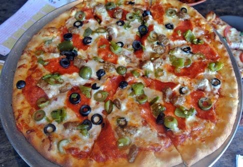 Copious ingredients is what you’ll find on Greg’s Special, a pie topped with pepperoni, spicy Italian sausage, black olives, green olives, Hatch green chile, tomato sauce and mozzarella. What a pleasant surprise to enjoy both black and green olives with all their similarities and dissimilar flavor properties. The Hatch green chile has a nice roasted flavor and just enough piquancy to be discernible. The olives, green chile and tomato sauce are all acidic with only the mozzarella and crust to temper those properties. Still, it’s an excellent pizza.
