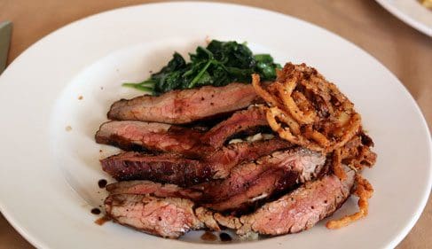 14 March 2015: My last experience with a coffee-rubbed steak was at Bobby Flay’s Mesa Grill in Las Vegas, Nevada. It left a rather indelible impression on me so when we espied it on the menu at Kasey’s, it was a foregone conclusion we would have to order it. The flank steak is grilled and sliced into small strips similar to roast beef. It’s an even better steak than the New York strip. We suggested to Gary that he find a way to bottle the coffee rub and serve it as a sauce even though a more prominent flavor is a Balsamic reduction drizzled on the steak. The steak is moist, tender and delicious. The accompanying mashed potatoes are, well, they’re mashed potatoes. Much better, if fortune smiles on you, is spinach sauteed in butter and garlic. It’s good enough to convert even avowed carnivores.