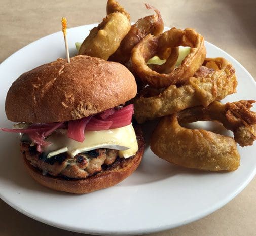22 February 2016: According to the National Turkey Federation, in 2013, more than 240.0 million turkeys were raised, of which more than 200 million were consumed in the United States. Three holidays account for nearly half the turkeys enjoyed across the fruited plain: 46 million were eaten at Thanksgiving, 22 million at Christmas and 19 million at Easter. Despite a very active lobby, the turkey has not made significant inroads as “the other white meat.” Perhaps that would change if more Americans were introduced to the turkey burger at Kasey’s. Though it is not “ground in-house from New Mexico grass-fed turkeys,” my server assured me the turkey was procured locally. Ground and shaped into a round patty, the turkey is terrific, a good half-inch thick and covering the bottom bun. Only three ingredients come standard on this burger: fig mustard, pickled onions and brie. To add anything else would be to desecrate a bastion of deliciousness. The fig mustard packs a pop reminiscent of Dijonnaise. It pairs well with the sweetness of the figs and the tanginess of the pickled onions while the brie is a nice counterbalance with its savory richness.