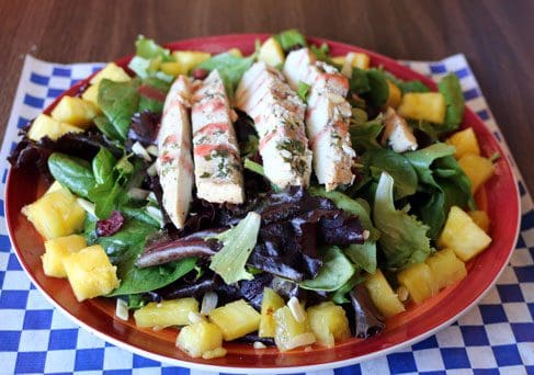 Cafe Caribe’s salad menu lists four innovative and inviting salads. The golden pineapple chicken salad may be the most “tropical” of the lot, a beautifully plated arrangement of mixed mesclun (a salad mix of assorted small, young salad green leaves), pineapple, dried cranberries, toasted almonds and grilled chicken. There’s not much (if any) dressing on this salad which means the other ingredients had better be able to stand out on their own. They do–and very well. Texturally, the toasted almonds and dried cranberries provide a nice contrast to the crisp greens, juicy pineapple and perfectly grilled chicken all of which together create a very good flavor profile.