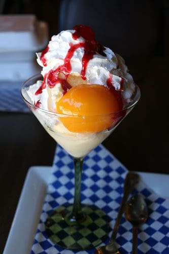 Just because peaches aren’t native to the Caribbean doesn’t mean enterprising chefs can’t incorporate them into delicious desserts. Appropriately, one of the best ice cream-based desserts anywhere in Albuquerque, is called the Peach Paradise. It’s easy to taste why. A large goblet is hard-pressed to contain the generous scoops of French vanilla ice cream with its characteristically richer and deeper flavor notes than regular ice cream along with whipped cream, a cherry sauce and sliced peach halves. It’s an excellent dessert with refreshing qualities and the superb flavors of fresh peaches and rich French vanilla.