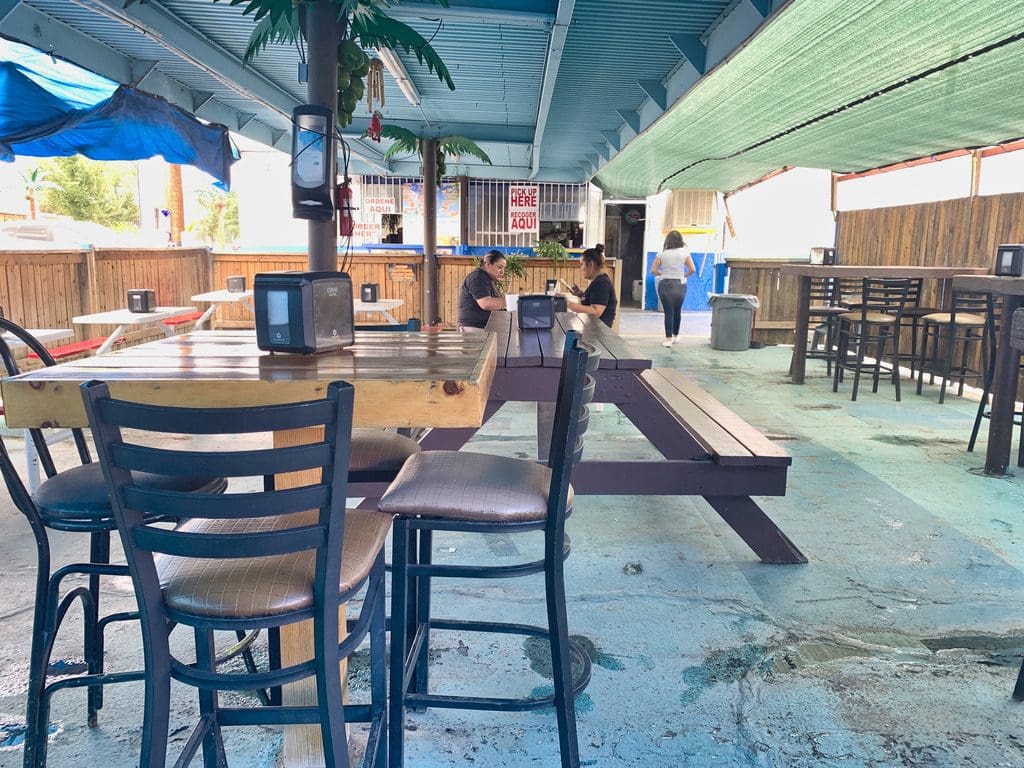 There are other elements to Sharky’s that evoke the sense that coastal Mexico has been brought to your neighborhood. Similar to many of the hut-like structures on the beaches of Sonora, Sharky’s is strictly a “to go” operation, not that you’ll have to go far. After placing your order at a counter, saunter on over to the covered patio which does a surprisingly good job shielding you from the elements. When the mercury climbs higher, soothing water misters cool the air. The picnic tables are much more functional than they are comfortable.