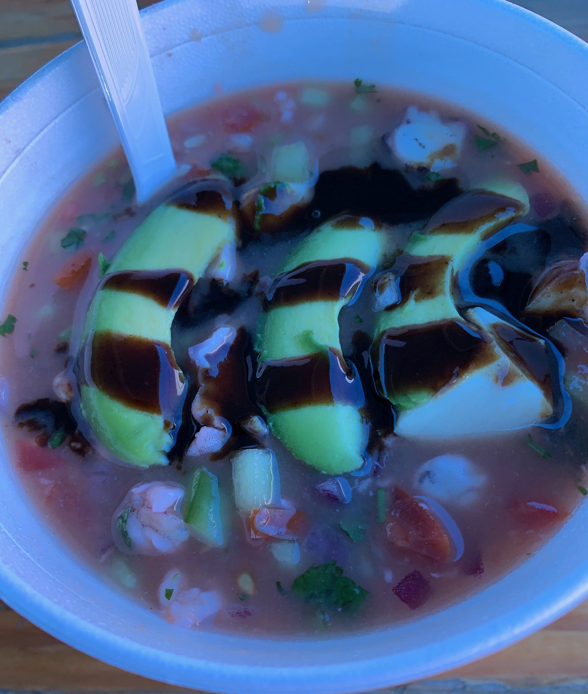 7 June 2015: It’s only fitting that the ceviche at Sharky’s be served in a bowl shaped like a boat. There’s a netful of fish and (or) shrimp in each order of ceviche and it’s very good. Served with sliced limes just in case they’re not sufficiently “citrusy” for you, the ceviche is refreshing and flavorful. It’s the perfect summer dish—light, bright and it won’t weigh you down during a sweltering day. The fish and shrimp are unfailingly fresh as are the chopped cucumbers, tomatoes and avocadoes, the latter of which are at the epitome of rich ripeness.