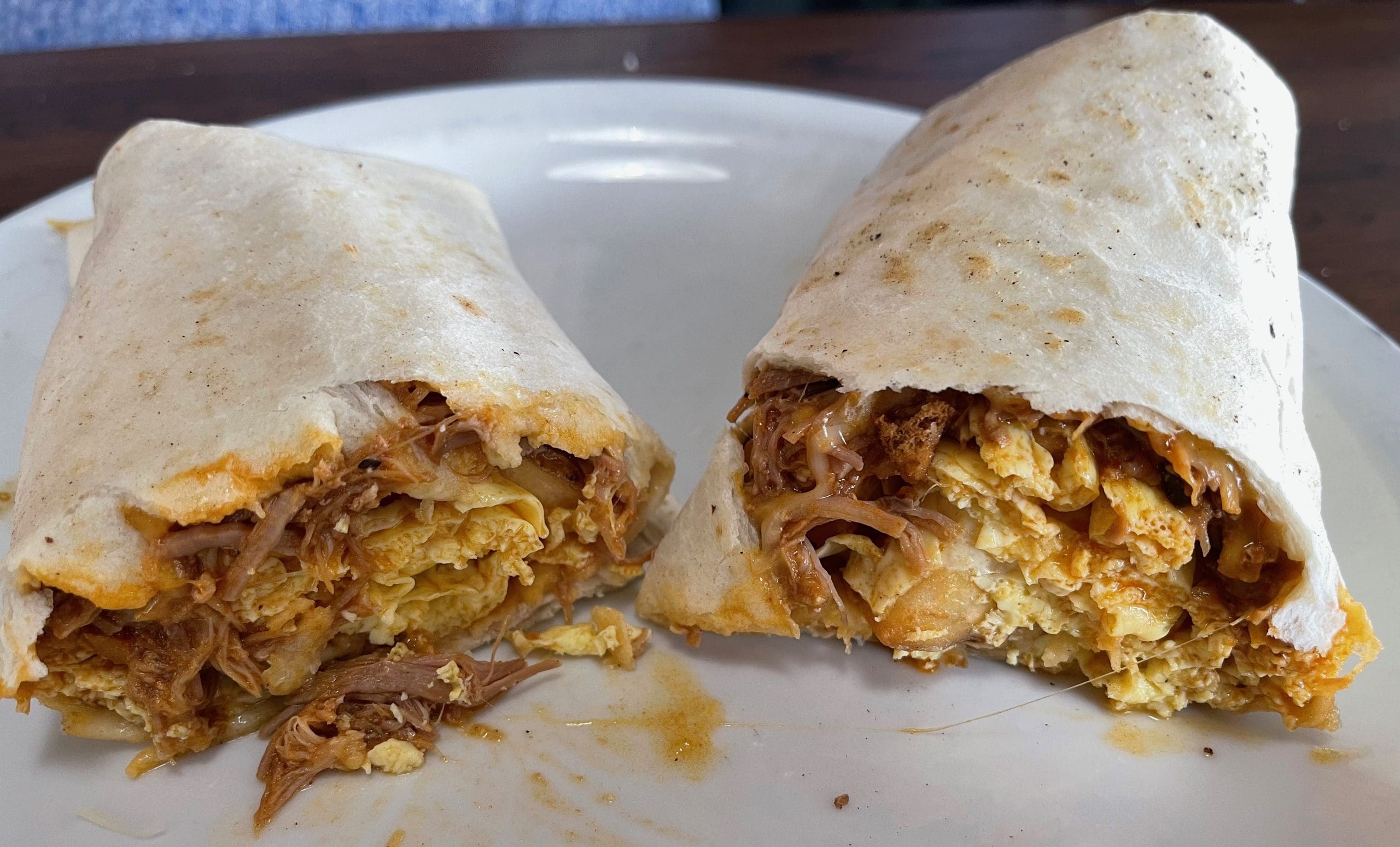 25 November 2021: For my Kim, a carne adovada burrito sans additional chile makes great sense. She contends that the chile in which the pork has marinated has a porcine-blessed flavor profile it might lose if the burrito was smothered. She was blown away by the sheer volume of pork with which this burrito is engorged. Tender tendrils of pure pork deliciousness marinated in chile practically made her swoon. The breakfast version of the carne adovada burrito also includes scrambled eggs, cheese and onions, all of which work well together.