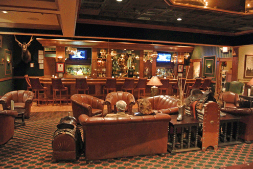 Inspired by the rustic elegance of ranch house comfort, the Ranchers Club is a celebration of one of New Mexico’s oft forgotten cultural aspects, the family ranch. The artwork, saddles, stirrups, lassoes and other western artifacts on the walls, many of them historical in nature, were, in fact, donated by the ranching community of New Mexico. The stirring black-and-white photographs on the walls were taken by prolific photographer Harvey Caplin. Artwork shares wall space with taxidermy animals. Jutting out from a spoke-shaped multi-layered chandelier in the main dining room are cow’s horns of varying sizes.