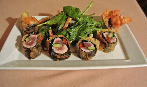 Among the more surprising appetizers on the menu are the spicy tempura tuna rolls, six pieces of sushi crafted from seared tuna and sheathed in a tempura batter. If you like seared or raw tuna, you’ll thoroughly enjoy this starter though fire-eaters who enjoy incendiary sushi rolls might miss the wasabi and soy sauce mix. We didn’t miss the sushi rice. The spicy tempura tuna rolls are served with a salad of tatoi and mizuna greens, wasabi peas, sesame sticks and just a light drizzle of wasabi pepper sauce.