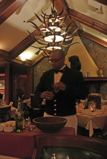 Not being as fond of beef as is my Kim, my choice was the Kurobuta Pork Rack which was carved tableside by the captain. Twenty-two ounces of pulchritudinous pork was surgically sliced to right-sized portions including two bones on which you’ll gnaw with alacrity. Most Kurobuta pork Ive had accentuates the delicate flavor of the Iowa raised pork, seasoning it lightly and pairing it with sweet flavors. The Ranchers Club seasons Kurobuta more assertively and pairs it with a Bourbon molasses barbecue sauce which is even more aggressive. You’ll enjoy the Kurobuta much more without the barbecue sauce, so you’ll want to ask for it on the side.