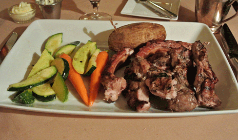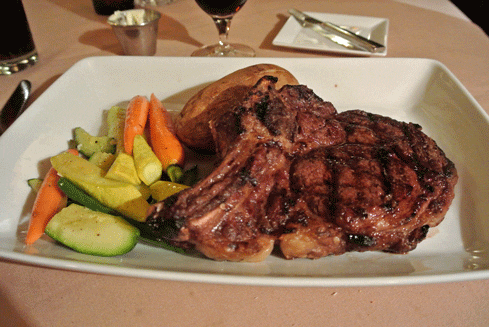 For my Kim, our affable captain Thomas, recommended the Cowboy Cut Bone-In Rib Eye, an eighteen-ounce slab of nicely marbled and full-flavored beef procured from a ranch in Nebraska. Perfectly prepared at medium, the rib eye is not for those of feeble appetite. It’s a formidable hunk of beef grilled beautifully, a moist and juicy steak which needs no amelioration. Since she asked for it, however, Thomas provided my Kim with a garlic sauce redolent with dill and lemon. He also had the kitchen prepare a baked potato even though baked potatoes aren’t among the listed accompaniments. Now that’s service! The steak also came with a vegetable medley, including sweet, al dente carrots.
