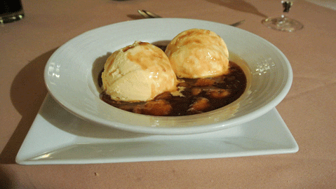 The dessert menu is more than interesting though we’ve never made it past the Ranchers Club nightly flambe dessert. On two occasions, that’s meant Bananas Foster prepared tableside. All eyes in the dining room will be trained on your table when your server pours banana liqueur into the frying pan and flames rise skyward. Bananas Foster is a very rich, very decadent dessert which originated in New Orleans. Having lived ninety miles from the Crescent City for eight years, we had our share of Bananas Foster in their city of origin. The Bananas Foster at the Ranchers Club are just as good.