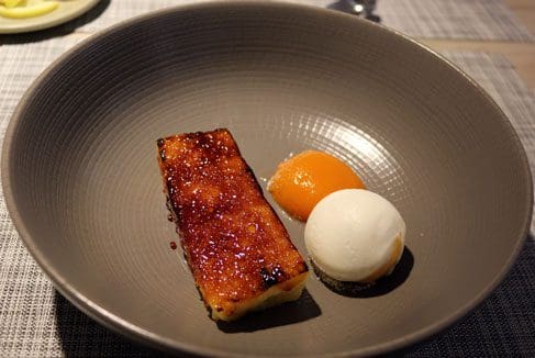 Popcorn ice cream also elevates a caramel brioche that by itself is merely outstanding. The top layer of the brioche is caramelized in a crème Brulee fashion. Puncture that sugary brown sheet and you’re rewarded with a custardy, eggy bread akin to a moist, rich bread pudding. Spoon on a bit of the popcorn ice cream and taste bud delirium might ensue. Then for even more sheer contrast, pair the brioche with the musky, tangy Abiquiu apricot half. This dish is as much an adventure in flavor discernment—so many complementary contrasts–as it is a spoil yourself indulgence.