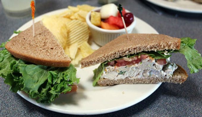 1 August 2015: We weren’t quite as enamored of the Chicken Apricot Salad Sandwich (diced chicken breast, apricots, walnuts, scallions, mayonnaise on whole wheat). That’s primarily because apricot and its musky, tart uniqueness wasn’t as prominent a presence on the sandwich as it should have been. Apricots are a difference-maker, the separation between merely very good and great. Without a strong apricot presence, this sandwich is still a very good chicken sandwich, but you can find those elsewhere.