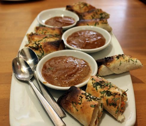 7 September 2015: The appetizer which first caught our eye bore the name tortilla spring rolls. What a great idea! Why have we limited ourselves to boring tortilla roll-ups, tortilla pinwheels stuffed with cream cheese and sundry ingredients? There are three types of tortilla spring rolls, the most enticing of which was the Thai Chicken Spring Rolls, flour tortillas sprinkled with herbs and baked in the hearth oven stuffed with bean sprouts, scallions, carrots, cilantro and mozzarella served with an addictive peanut sauce. The peanut sauce is the topper, both literally and figuratively. As good as peanut sauce at many Thai restaurants, it’s the perfect dip for an otherwise very good starter, elevating it into an excellent introduction to CPK.