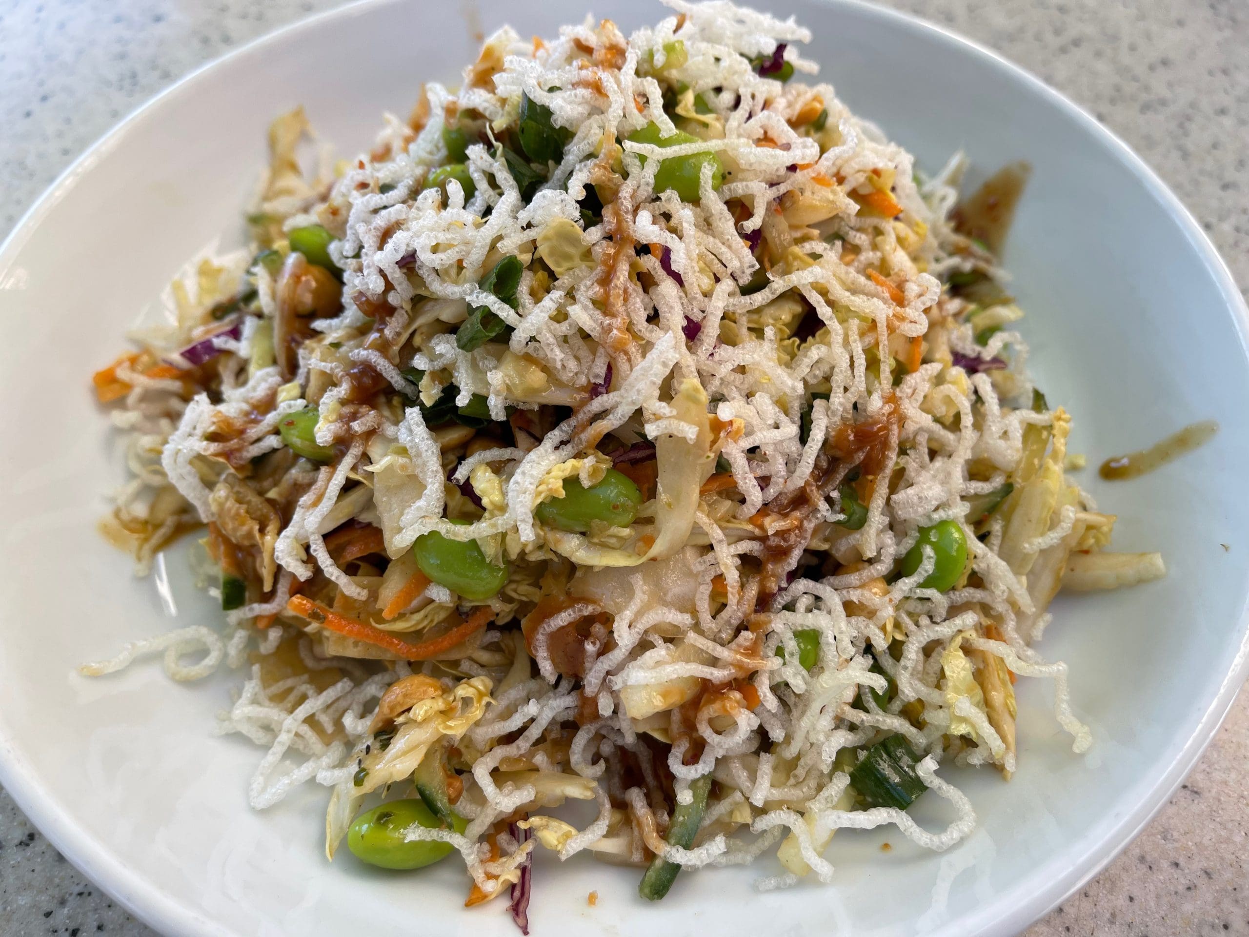 19 February 2022: Besides, how can you not like a restaurant that serves a pretty mean Thai Crunch Salad (crisp veggies and fresh cilantro with chicken and the crunch of peanuts, wontons and rice sticks. Served with Thai peanut dressing. Also available with fresh avocado.)? Our kind server split this salad for us and still neither of us could finish it. Talk about a substantial salad. Talk about a delicious salad. The genius is tossing all those beautiful, mostly healthy ingredients with a Thai peanut dressing that’s very well balanced between sweet and savory and between creamy and thin. This is a salad we’ll be duplicating at home.