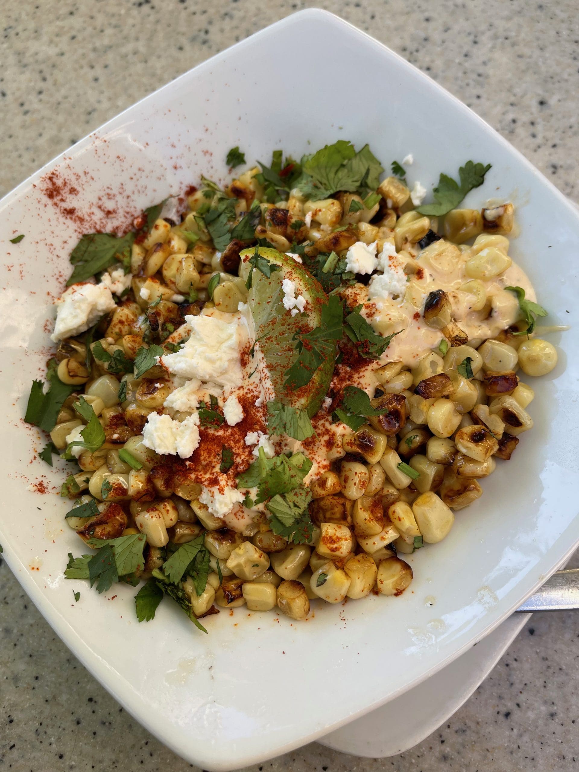 Today Mexican street corn has transcended culinary boundaries and borders. You can find it in fine-dining restaurants, roadside stands…and in California Pizza Kitchen. CPK’s Mexican street corn (roasted with smoked paprika, feta and Parmesan served with fresh cilantro, lime and housemade ranchito sauce) didn’t exactly remind me of horno-roasted corn, but it was quite good. Most memorable is the discernible char on virtually every niblet of corn. That char imparted a sharpness that paired very well with the smokiness of the paprika and the tanginess of the feta. Even my persnickety grandmother would have enjoyed this Mexican street corn.