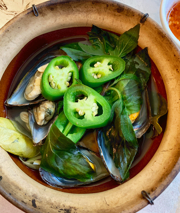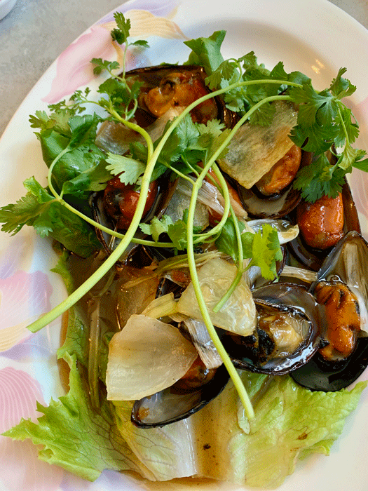 24 May 2019: Saigon actually offers three different appetizers showcasing mussels. Two, including mussels with sesame seed, are fried. The other, steamed mussels in lemongrass is more akin to the mussels dishes in a broth you find in French restaurants. With its minty-lemony notes, lemongrass won’t necessarily remind you of the influence of white wine when paired with mussels, but it too, lends palate-pleasing qualities. Jalapeños, of course, lend piquancy. Altogether, herbaceous qualities meld very well with the almost ethereal ocean flavor of mussels.