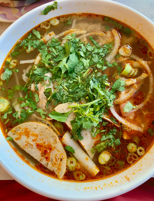 24 May 2019: On my eleventh day of suffering from a debilitating cold-flu-malaise, my friend Tuan suggested bun bo Hue might be just what the doctor ordered to clear my congestion. Bun bo Hue, as faithful readers might recognize, is my very favorite of all Vietnamese soups. Yes, even over pho, the national national dish of Vietnam, a comfort food favorite that has captured the affections of diners the world over. When both Tuan and I ordered it, our server explained that while Tuan would probably enjoy it, it might be too “pungent” for me. Tuan, who’s called me “the most Asian Caucasian he’s ever met,” laughed and assured her I could handle it.