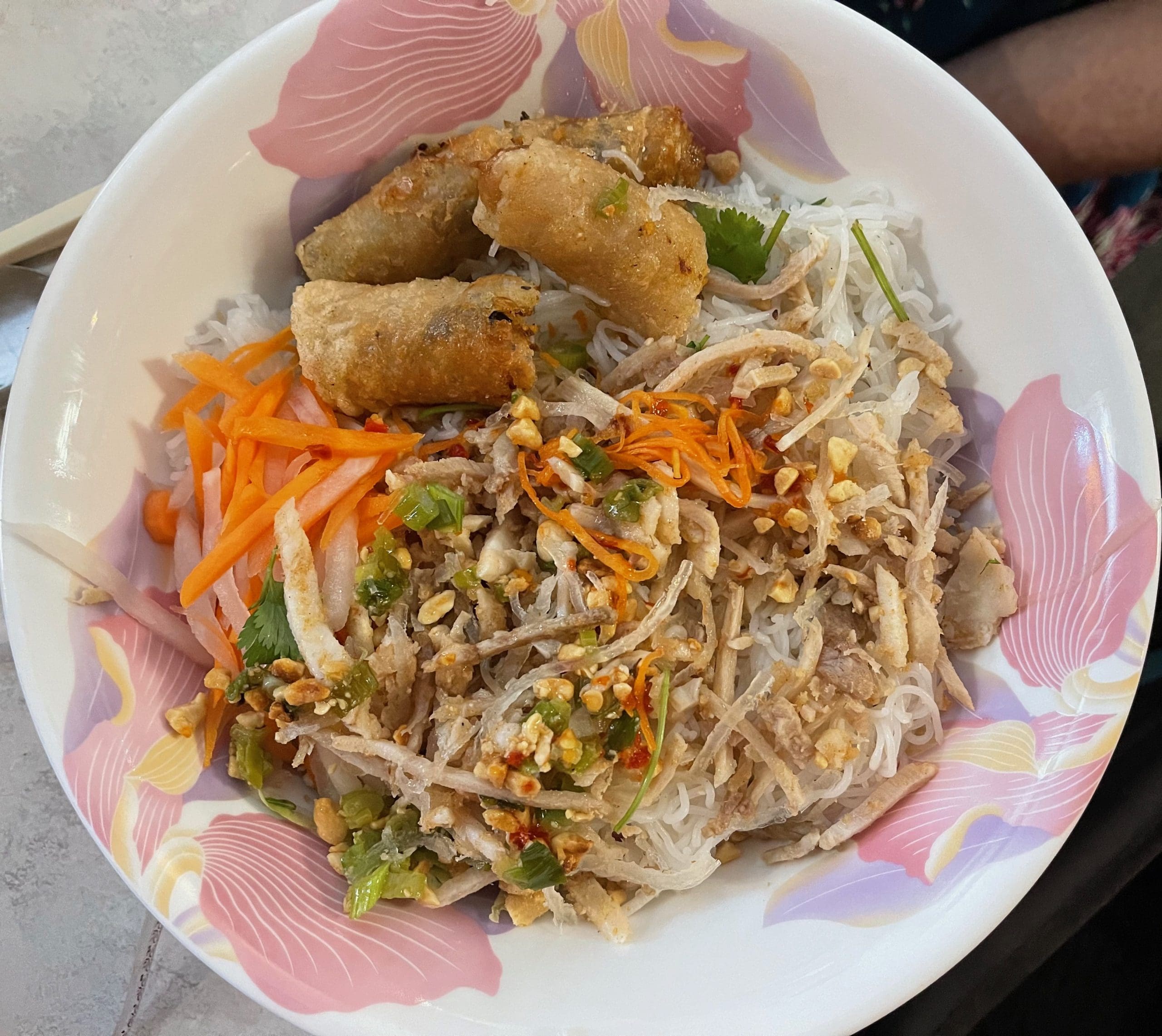 10 April 2022: Many rice entrees begin with “dry rice stick noodles” which despite an unappetizing name, really means long-grain rice vermicelli noodles prepared with no sauce. There’s nothing dry about them despite the name–and after these noodles absorb the flavors of all with which they’re prepared, you’ll have a fun feast slurping up these waifishly thin noodles. In the photo above, dry rice stick noodles are practically covered with halved egg rolls and grilled onion beef. Julienned carrots and white onions along with crushed peanuts add to the menagerie of flavors which you can then douse liberally with fish sauce if you’d like.
