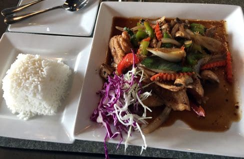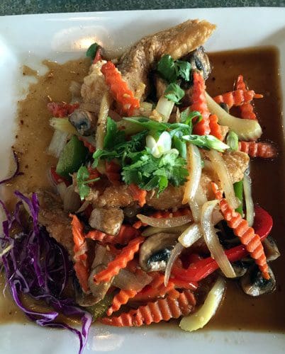 8 January 2016: Four items, all fish-based, festoon the seafood menu. Each item seems to emphasize a different flavor profile. One fish dish is made with curry (with hopefully more balance than the Pra Ram) and another with a sweet and sour sauce. Bill’s choice was the hot and spicy fish filet which he requested be prepared “New Mexico hot” instead of “Thai hot.” This dish is sauteed with onions, basil, mushrooms, lime leaf, carrots and bell peppers in a piquant chili sauce. As is often the case in Thai restaurants, one highlight is the freshness and aesthetic presentation of the vegetables which are prepared a tad under al dente. Both vegetables and fish inherit the heat and flavor profile of the chili sauce without compromising their own inherent flavors. This is a very enjoyable dish!