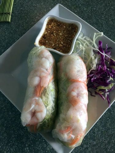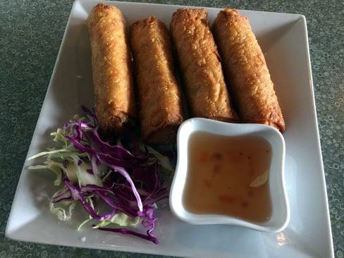 7 January 2016: Egg rolls are somewhat anomalous at Thai Spice. Most Thai egg rolls we’ve had at other Thai restaurants aren’t much thicker than a cigar. In appearance, these are similar to Chinese egg rolls–thick and plump. That’s where the similarity to Chinese egg rolls (which have become the most boring egg rolls among all Asian restaurants which serve them) ends. These golden hued beauties are engorged with silver noodles, ground pork and vegetables (mostly cabbage). You don’t have to charter an expedition to locate pork; it’s plentiful in each egg roll. They’re delicious and are served in quantities of four per order. The accompanying sauce is a fairly typical sweet plum sauce that lends little to the egg rolls.