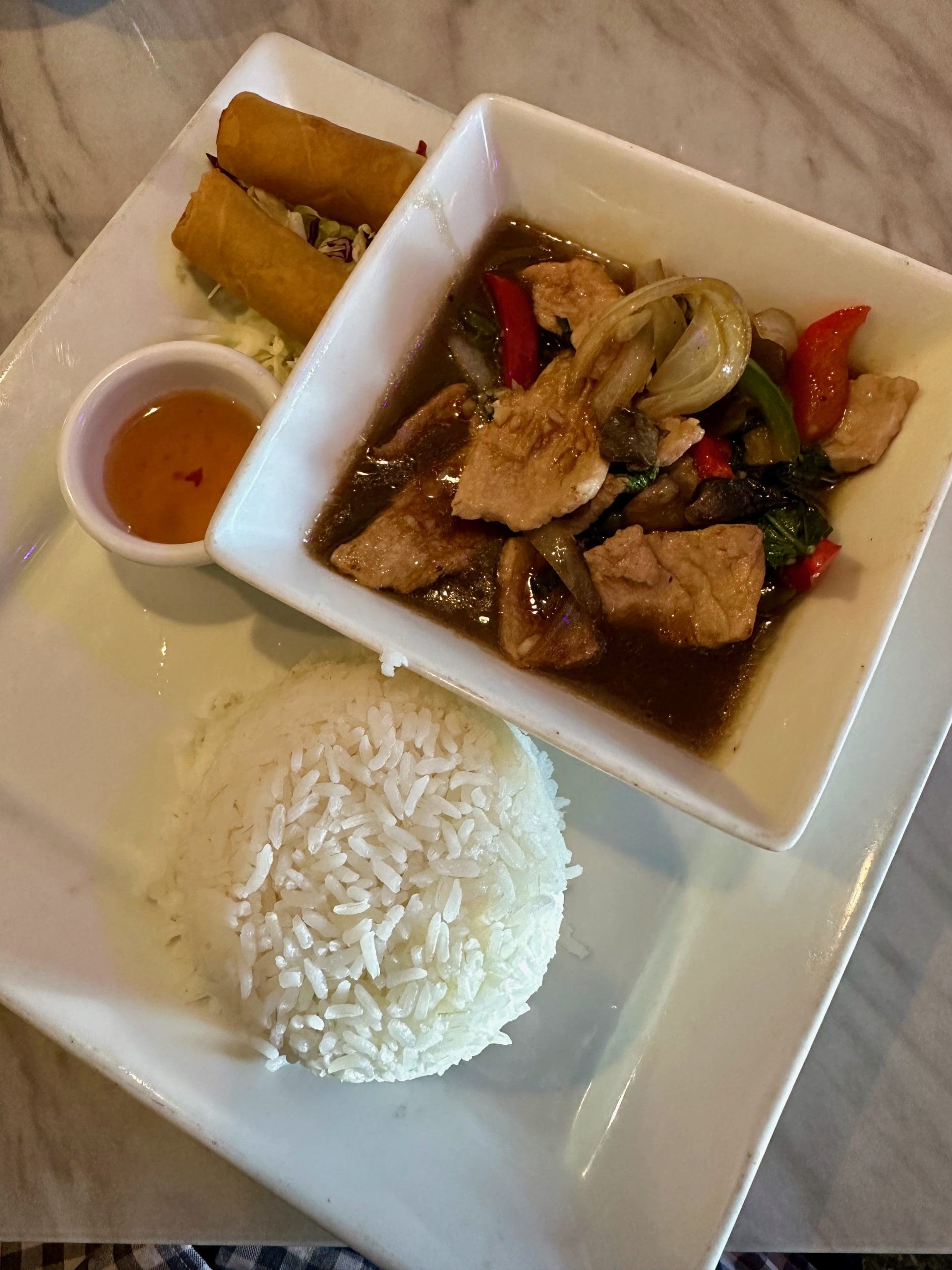 2 December 2024: In the culinary sphere, terms such as “cheap eats” are relative. In the 1990s when the Albuquerque Tribune published a weekly “cheap eats” column, meals qualifying as cheap eats were priced significantly lower than meals in the 21st Century. Though “cheap” may be somewhat of a misnomer (especially by 20th Century standards), there are still bargains to be found. At Thai Spice, for example, lunch specials include soup, an entree, two egg rolls, a tapioca pudding dessert and your choice of brown or white rice for significantly less than a mortgage payment.
