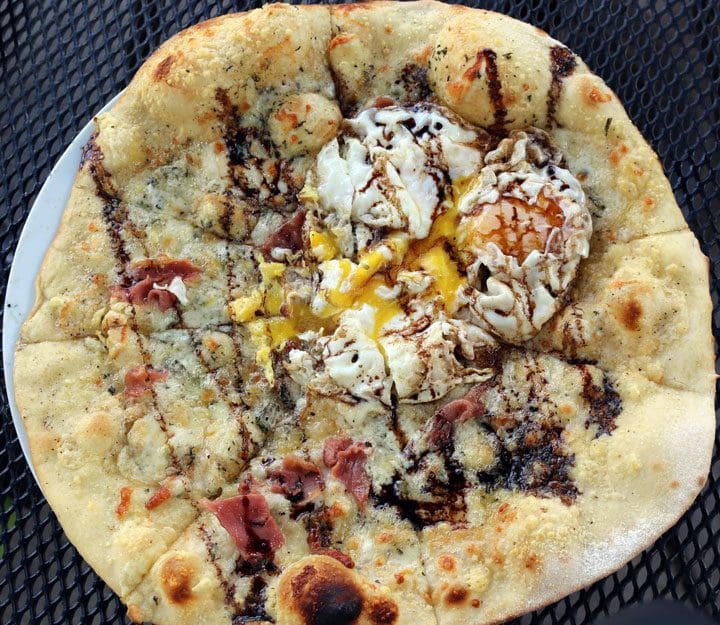 29 July 2017: One of the highlights of visiting my mom in Peñasco is enjoying organic farm-fresh eggs for breakfast. Online debates rage as to whether there’s a discernible difference between farm-fresh eggs and their store-bought counterparts. Having been raised on the former, I’m a stickler for farm-fresh eggs. That said, the three eggs on Scalo’s Pizza Colazione (sunny side up egg, speech ham, Fontina, Gorgonzola, fresh rosemary, aged balsamic) reminded me of the eggs we gathered every morning from my grandmother’s chicken coop. This is a terrific pizza, my only nit being that the eggs shouldn’t have been congregated so closely so as to better distribute the unctuous yolk. The cornicione, an Italian term for the “lip” or puffy outer edge of the pizza is soft and chewy with a pronounced flavor of oven-baked bread. In combination, the Fontina and Gorgonzola provide a wondrous cheesy flavor that goes very well with the salty ham. In my pantheon of New Mexico’s very best pizzas, this one certainly deserves a high spot. It’s outstanding!