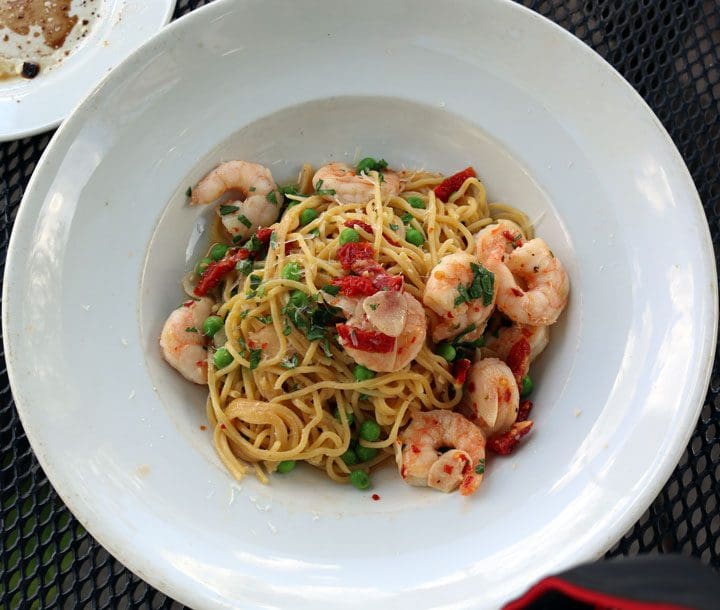 Stopped in for my Filetto. Eeek…mustv’e been a busy Fri/Sat….out of filets!!! Mama Mia who ever heard of such a thing. Anyway, my “on the ball” waitguy checked to offer a rib-eye with the same presentation ala sauce and risotto. Rather than possibly spoil things, I decided to be edgy and try one of my “banes”, the unidish. Had the “Spaghettini olio e aglio con gemberetti” olive oil, garlic, crushed red chile, shrimp, sun dried tomatoes, peas, white wine lemon butter sauce. Whoa indeed, it overflows with those gemberetti, almost hiding the perfectly cooked spaghetti. I found the sauce to be a new delight while highlighted by a nice bite which fascinated me as I could hardly espy any specks of the crushed pepper! The green peas provided contrasting splashes of sweet. I certainly must give it a “molto buono”!