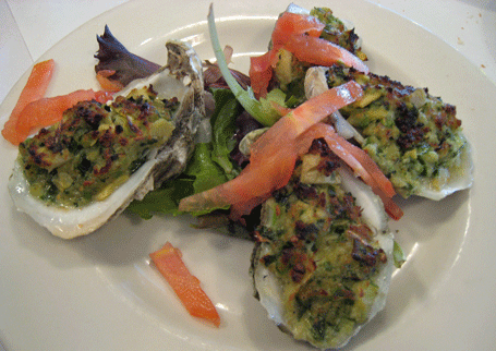 5 February 2012: You would not, however, want to pass on an antipasti as terrific as the ostrichi al forno, four oysters on the half-shell baked with artichoke, aioli, Reggiano and truffle oil. It’s a wonderful variation on Oysters Rockefeller and much better, too. The greenish hue of the artichoke-infused, Reggiano blessed oyster appetizer is intriguing, but it’s the flavor of the dish–the brininess of the oysters, the fresh “greeness” of the artichokes, the sharp nuttiness of the Reggiano–that will ensnare your affections. You’ll want a dozen of these beauties.