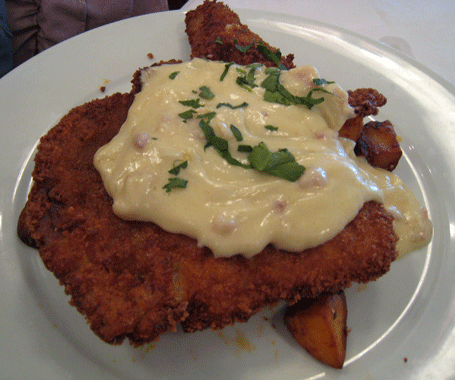 5 February 2012: The Costletto alla Milanese Mostarda, a pounded bone-in crispy pork chop with an onion, bacon, capers and grain mustard cream is somewhat reminiscent of a German weinerschnitzel though much more lightly breaded. The mustard cream is more akin to a French Hollandaise sauce than to a pungent, tangy German mustard. This prodigious hunk of porcine heaven is as substantial in flavor as it is in portion-size. The pork chop is nearly fork tender and is terrific with or without the mustard cream.