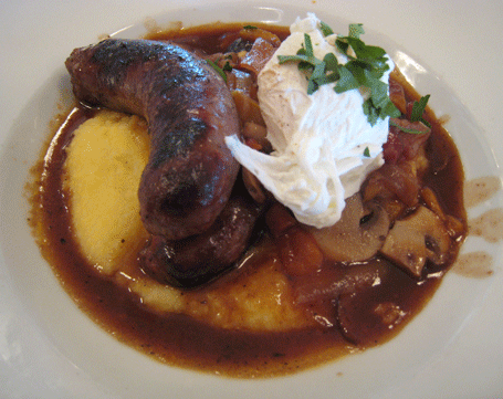 5 February 2012: A more “breakfasty” brunch offering is the Polenta y Salsiccia, creamy polenta, grilled sausage, poached eggs, roasted peppers and mushrooms. Polenta (not necessarily synonymous with grits) serves as the base for this dish–literally. Piled atop the polenta are two sausages, one spicy and one sweet and frothy poached eggs. The objective of this dish is to spread the runny yokes throughout the dish, making it a melange of flavors. It may not be as aesthetically pleasing, but the combination of ingredients works very well.