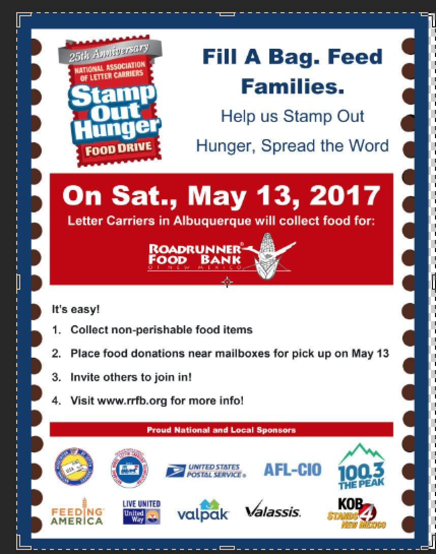 The great folks at Albuquerque’s Roadrunner Food Bank (RRFB) are gearing up for the Stamp Out Hunger food drive on Saturday, May 13 and they need YOUR help. Letter carriers, the US Postal Service and so many other national and local partners come together to collect non-perishable food in 10,000 communities across the country to help hunger-relief organizations including food banks, food pantries, soup kitchens, and others. If you or someone you know can volunteer at one of eleven metro area post offices, please sign up ASAP via AnnaMarie Maez. Volunteers will be unloading food from letter carrier vehicles and sort food at post offices. It can be a bit physical so you’re advised to dress comfortably and wear close-toed shoes. More information is available on the Roadrunner Food Bank’s Web site.