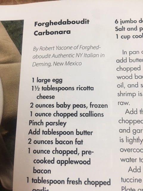 In the past twelve months, perhaps no restaurant across the Land of Enchantment has garnered as much acclaim or brought as much gold to the Land of Enchantment as Deming’s transcendent Forghedaboudit, a fabulous dining destination to which all wise men and women should pilgrimage. When Pizza Today, a highly respected trade publication considered entrees worthy of being honored in its 2018 menu guide of Italian food favorites, Bob Yacone’s incomparable carbonara was a no-brainer. Your humble blogger had the great fortune of enjoying this paragon of rich deliciousness (which you’ll see listed among Gil’s “best of the best” dishes for 2017). Visiting Forghedaboudit should be every serious diner’s New Year’s resolution. You may want to move to Deming after one visit.
