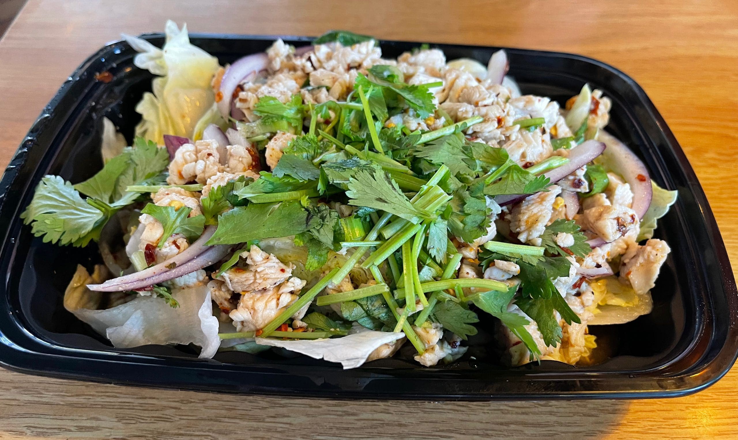 30 July 2021:Larb–often spelled laab, laap or any number of phoenetically similar spellings–a refreshing Thai salad is tangy, bright and refreshing, yet spicy and full-flavored. It’s perfect for hot summer days! Or any day if you’re my friend Bill Resnik. Usually made with ground chicken, beef, lamb or pork;, lots of fresh herbs (mint, Thai basil or cilantro); lemongrass; garlic; fresh chilies; red onions; lime juice; and green onions, it’s Southeast Asia’s answer to calorific American salads. Siam Cafe’s version is one of the very best in Albuquerque, made especially well if it’s prepared at the “hot” or “Thai hot” level of piquancy.