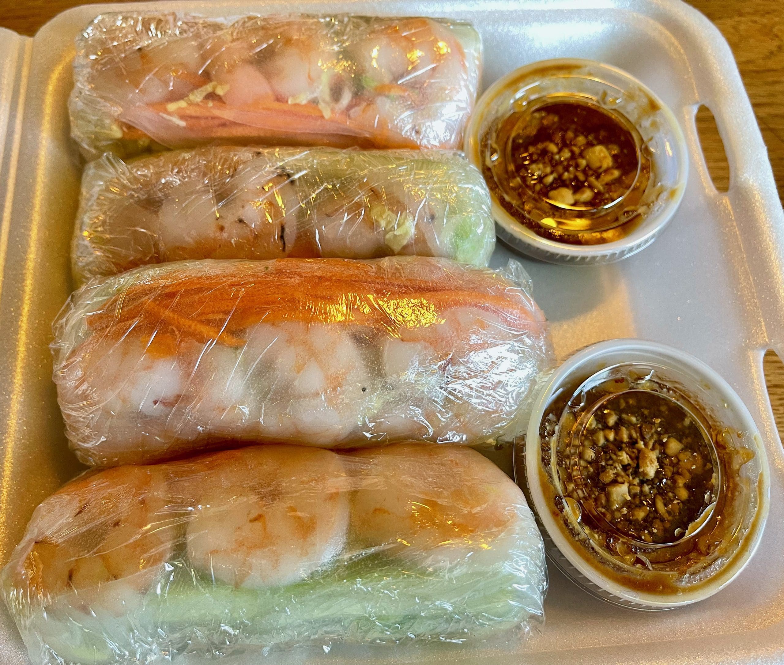 30 July 2021: Fresh spring rolls are more commonly associated with Vietnamese cuisine, but restaurants like the Siam Cafe have mastered the art of packing ingredients ((rice noodles, shrimp, carrot and lettuce) into translucent rice wrappes. Spring rolls are the antithesis of their fried counterparts–at last in terms of preparation. Determining which are better is a matter of taste. The spring rolls at Siam Cafe are served with a peanut sauce.
