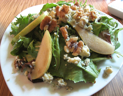 3 August 2010: Sadly no longer on the menu as of December, 2023 is the pear and Stilton salad constructed with walnuts, Stilton blue cheese, field greens and a port vinaigrette dressing. Stilton blue cheese, a pungent cheese produced only in three English counties, is often eaten with pears, a combination that pits the strongly flavored cheese with the tangy-sweetness of pears. It’s a combination that works, as does the addition of walnuts, not sugared but in their natural state. The field greens are fresh, crisp and a perfect vehicle for the port vinaigrette, a lip-pursing tangy dressing.