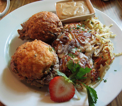 3 August 2010: Perhaps even better, if possible, as a morning sandwich option is a brunch-only offering of sausage sliders. Housemade green chile Cheddar biscuits are the canvas for thick disks of green chile turkey sausage, giving you an eye-opening one, two punch of green chile to wake you up. If all that green chile doesn’t do the trick, the chipotle gravy will. It looks innocuous, just like any other brown gravy, but it packs a piquant punch. Unlike the flaky, fall-apart biscuits that don’t hold together, the green chile biscuits hold up well against the moistness of the absolutely delicious turkey sausage.