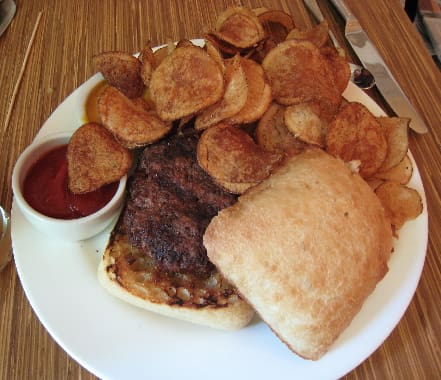19 September 2008: The Slate Burger crafted with black angus beef and served on a ciabatta bun is so good, it (this may sound like heresy coming from me) doesn’t need green chile. As with many New Mexicans, green chile has become a “crutch” and it’s hard to conceive of a burger being good without it. While you can ask for green chile on your Slate Burger, it’s absolutely unnecessary. The main reason is the perfectly seasoned, perfectly prepared to your exacting specifications (it’s perfect at medium) all natural, local beef sourced from The Western Way in Moriarty. It’s a high quality beef with nary a hint of sinew or excess fat. The Slate Burger is an excellent burger for which you can pick your toppings (such as cheese, bacon, green chile, avocado) from a bevy of fresh ingredients!
