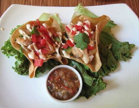 19 September 2008: The menu includes several seafood entrees, including fish tacos, an entree few restaurants in New Mexico seem to do well. The Slate Street Cafe’s twist on this California favorite is to compose the tacos on deep fried corn shells, fashioning two crispy corn cups engorged with sundry ingredients. Similar to tostadas, these tacos are a challenge to eat and you might have to dredge the ingredients out of the cup with a fork because the shell falls apart otherwise. Insofar as taste, these are quite good with citrusy, briny and acidic tastes melding together quite well.