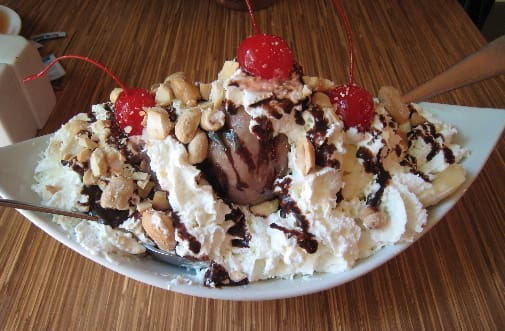 3 August 2010: There is, for example, chocolate cake like your mother used to make. There’s a bread pudding with a warm rum sauce–and there’s also a banana split big enough for two. This banana split includes some departures from the conventional Dairy Queen style banana split and its de rigeur vanilla, strawberry and chocolate ice creams. The Slate Street Cafe’s version replaces the strawberry ice cream with a rich, flavorful and tangy blueberry ice cream and its chocolate ice cream has more of an adult (less cloying) flavor. The bananas are caramelized and both peanuts and cashews are piled on top of the real whipped cream for a nice salty taste contrast. This is a calorie-laden bit of heaven.