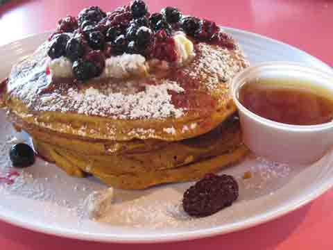 23 November 2008: Eli’s pancakes will cure the early morning blues (or anything else that ails you). A large stack (four) of pumpkin pancakes with pinon nut butter topped with assorted berries may be the very best pancakes you’ll ever have. They’re stick to your ribs pancakes, the panacea for cold mornings. Cinnamon and pumpkin pie spice emphasize the flavor of pumpkin while the berries provide a tangy contrast. The syrup brings together the complementary tastes of sweet, tangy and pumpkiny. Share these with people you love.