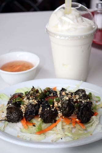 Excluding beverages, there are 115 items on Que Huong’s menu. It’s a veritable compendium of Vietnamese cuisine, showcasing everything from pho to noodle bowls and rice dishes. You could sample something new every day for nearly four months, but chances are you’ll find something wonderfully addictive from which you’ll be hard-pressed to deviate. For me, that one beguiling temptress is durian shakes. Considered the “stinkiest fruit in the world,” durian is an acquired taste, one which even bizarre food gurgitator Andrew Zimmern can’t stomach. Servers at Vietnamese and Thai restaurants still give me “are you crazy?” looks every time I order it, but it’s one of my favorite beverages.