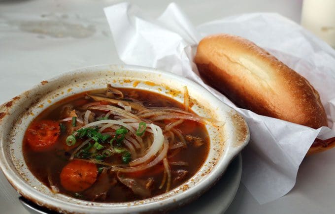 The menu lists two sandwiches. One is the grilled pork chicken or vegetarian banh mi. The other is called a “Beef Stew Sandwich” even though it’s far from a conventional sandwich. It is essentially an appetizer-sized bowl of beef stew Vietnamese-style. What makes it a sandwich is the baguette which accompanies the beef stew. Crispy on the outside, soft and pillowy on the inside, the baguette is perfect for dredging up the luscious stew. Talk about comfort food. The steamy, fragrant beef stew does indeed include beef chunks along with sliced carrots, scallions, white onions and noodles. It’s redolent with star anise and fresh herbs which coalesce into one uniquely wonderful, delightfully addictive flavor.