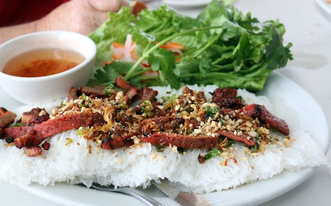 In ancient and contemporary cuisine across Greece, the Middle East and Eastern Europe, stuffed grape leaves are a ubiquitous dish. Though not indigenous to Southeast Asia, grape leaves have found their way into Vietnamese cuisine, a remnant of French colonization. Large grape leaves are rolled with a mixture of ground beef, cilantro and scallions seasoned with various herbs and spices then served with fish sauce. Though served five per order, the stuffed grape leaves at Que Huong aren’t quite as sizeable as dolmas at local Greek and Middle Eastern restaurants tend to be. In terms of flavor, dolmas and Vietnamese grape leaves are worlds apart, as different as night and day. Both are uniquely delicious onto themselves.