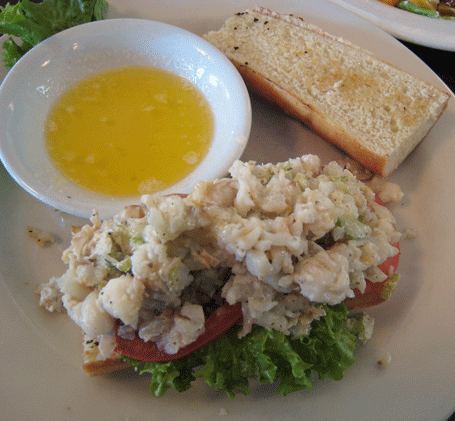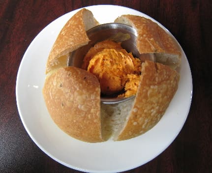 An evidently well-prepared wait staff is cordial, professional and eager to share their knowledge of both the building’s history and the restaurant’s diverse menu. When our waitress couldn’t answer a question we asked about the bar towels used instead of napkins, she quickly dispatched the day manager who regaled us with interesting details on where the idea for bar towels came up. We also learned that the herb bread brought to our table has a history even more interesting than that of the restaurant. The bread comes from a culture whose progenitor traveled the Oregon trail in 1845. It is baked in-house and has that yeasty bouquet true connoisseurs of the “staff of life” crave. Best of all, we’ve had it served to us with a brilliant orange-red oil made from achiote a subtly flavored paste which has a pleasant flavor. Better still is the achiote butter (pictured above) which enlivens the bread even further.
