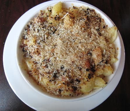 11 October 2008: You can’t say “comfort food” without mentioning macaroni and cheese, a fact obviously recognized by the Standard Diner. The Standard Mac and Cheese features baked shells with crisp bacon, Guinness and fine Irish Cheddar cheese sauce covered with herbed bread crumbs. For a pittance more, you can add green chile and smoked salmon to the mix. The only item we would dispense with entirely are the herbed bread crumbs. Our entree arrived with herbed bread crumbs a plenty, so many that we wondered if a clumsy chef had spilled the box’s entire contents onto the entree. The bread crumbs serve only to desiccate what is otherwise a moist and very good entree.