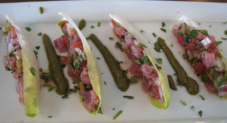 30 January 2011: Yet another intriguing starter which failed to deliver on the intriguing promise of excellent ingredients is a watermelon and tuna ceviche. Nested on endive leaves is a ceviche made from sashimi tuna, Hatch green chile, red onions and chopped tomatoes. Unlike traditional Mexican ceviche found in so many local restaurants, the Standard Diner’s ceviche is not marinated in citrus juices. That may be the start of its downfall, but the accelerant is most certainly the endive leaves which are bitter receptacles for what might have otherwise been at least passable ceviche. The lemon cilantro coulis was also uninspired, the flavor of tangy lemon and refreshing cilantro failing to coalesce into any semblance of deliciousness.