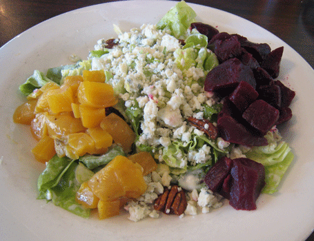 Appetizer options (they change frequently) have included BBQ Lamb Quesadilla, slow-cooked lamb top-round, housemade BBQ sauce and Jarlsberg cheese grilled in a tortilla and served with a tangy yogurt, cucumber raita (a traditional Indian style yogurt-based condiment). While the BBQ sauce was surprisingly ordinary, the raita was refreshing and delicious–almost a cross between Greek tzadziki sauce and the cucumber sauce which often accompanies satay in Thai restaurants. The lamb deserved better!