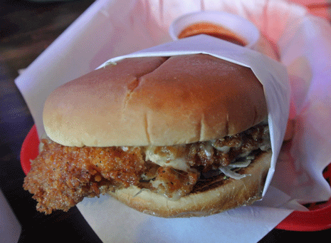 29 September 2012: It takes two hands to handle the behemoth buns which wrap themselves around cheese, tomato, lettuce, a full fried chicken breast and a buffalo sauce as lethal as gunpowder in the legendary buffalo chicken sandwich. Buffalo chicken wings have never seen a sauce quite as incendiary–or quite as good. It’s a better chicken sandwich, by far, than you’ll find at any of the fried chicken chains. My friend and colleague Fred Phillips loves this sandwich so much he’s earned the sobriquet “Four Bite Fred” for the ardor with which he attacks it. He’s been responsible for introducing more people to this sandwich than most online dating services have made lifelong matches.