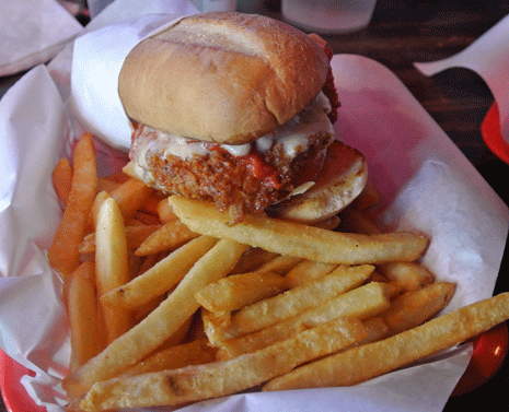29 September 2012: The chicken Parmesan sandwich, an Italian-inspired creation has everything a brimming plate of chicken Parmesan might have save for a side of spaghetti. The chicken breast is roughly the size of what you’d get in the Italian dish, maybe even in a Texas plate of chicken fried chicken. It protrudes well beyond the bun at all sides. It’s a thick chicken breast with a relatively light breading considering its size. The marinara sauce is thick, too, and draped over by a generous amount of cheese. The French roll isn’t nearly formidable enough to hold in its contents so you’ll probably have to eat this sandwich much as you would chicken Parmesan.