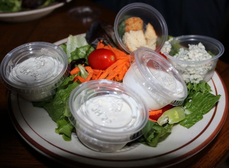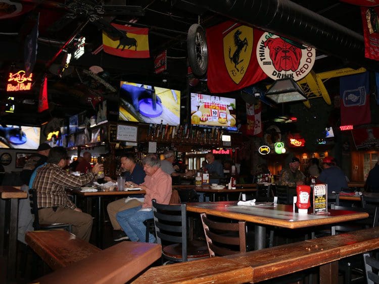Step inside and it may take you a few minutes to adjust to the capacious dimly-lit dining room (heaven help you if you wear transition glasses) where there’s something to see wherever you turn. Once adjusted, your eyes will scan the room and maybe take in the banners suspended from the ceiling in much the way knights’ banners adorned the great halls of medieval castles. Perhaps they’ll fixate on the large flat screen televisions (which provide much of the venue’s illumination), all tuned to sporting events. Patrons endowed with XY-chromosomes will likely focus on the menu and the waitresses, not necessarily in that order.
